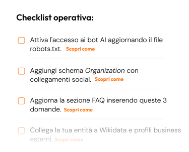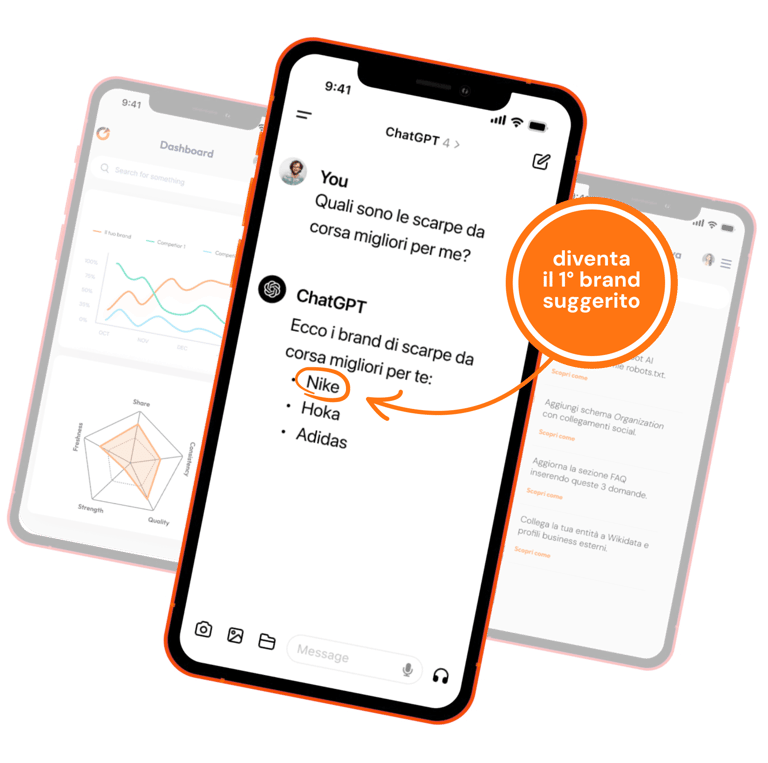 Ottieni in pochi minuti una panoramica intuitiva della tua presenza sulle AI e la lista delle azioni operative più efficaci per essere suggerito prima dei competitors